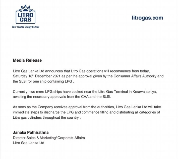 Litro Gas Lanka Ltd announces that Litro Gas operations will recommence from today, Saturday 18. December 2021 as per the approval given by the Consumer Affairs Authority and the SLSI for one ship containing LPG.