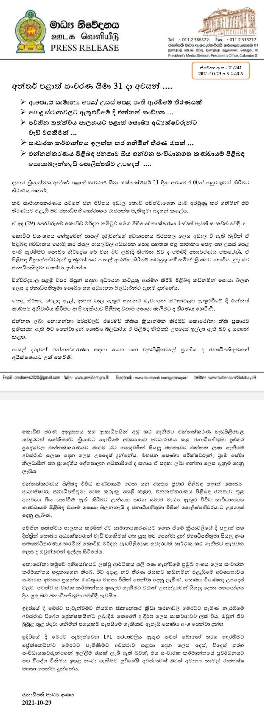 Later, the constraints imposed on crossing provincial borders were extended until October 21. However, upon the directives of President Gotabaya Rajapaksa, it was decided on October 20 that the restrictions would remain in place until the end of the month.